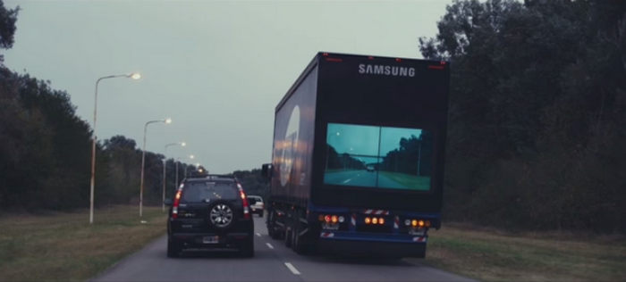 Всем автомобилистам хорошо известна ситуация, когда нужно обогнать большой грузовик, из-за которого впереди ничего не видно. Обгон в таких условиях чрезвычайно опасен. Аргентинское отделение компании Samsung предложило решение этой проблемы с использованием современных технологий. Проект получился относительно недорогим и, что не менее важно, простым в реализации. Инженеры Samsung предложили устанавливать грузовики и фуры с транзитными прицепами специальные экраны.
